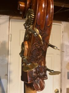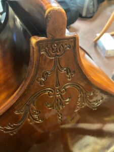 Here is a 1998 Golia double bass from master Italian luthier Luciano Golia. This was a custom setup job.On this instrument, I dressed the fingerboard (planed and sanded). I then installed a new bridge with adjusters, and I installed a new sound post. This work was done for Dave Couch. This bass had beautiful ornamentation as you can see below: